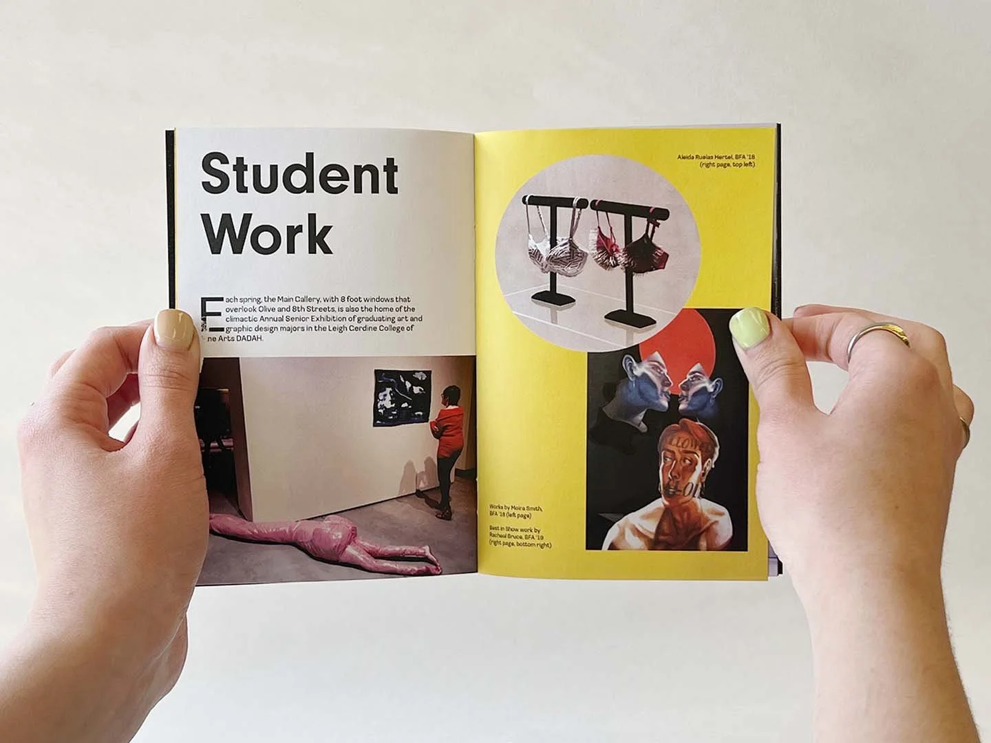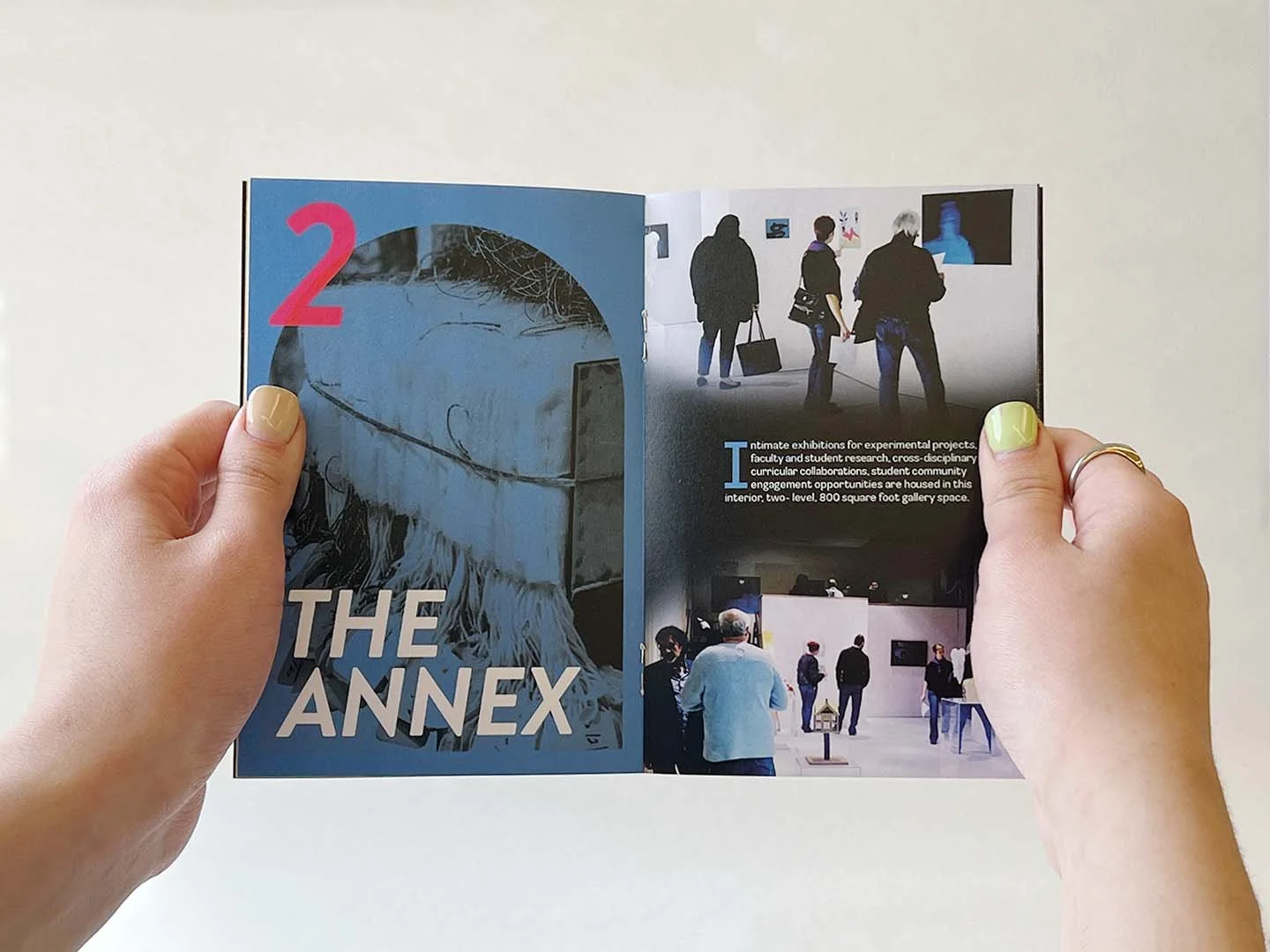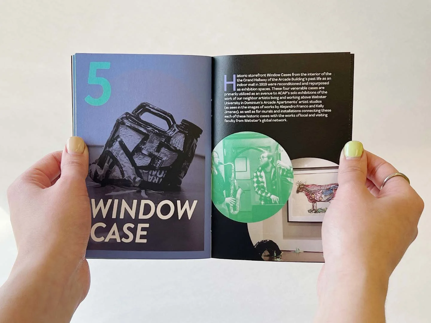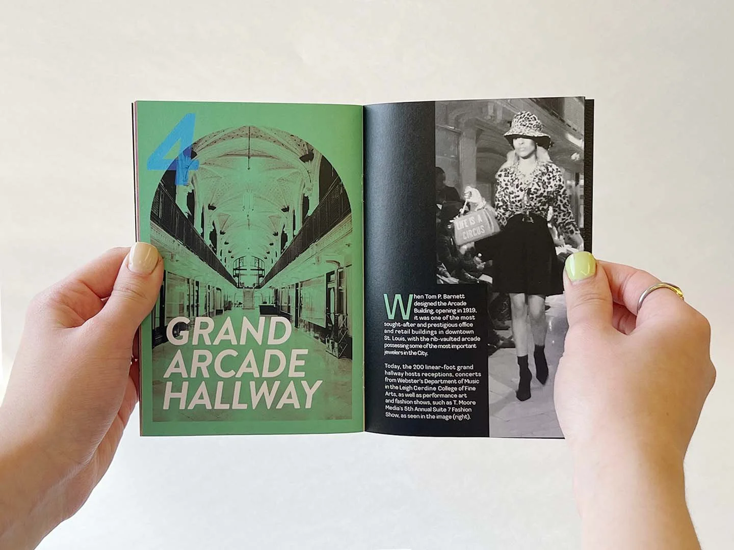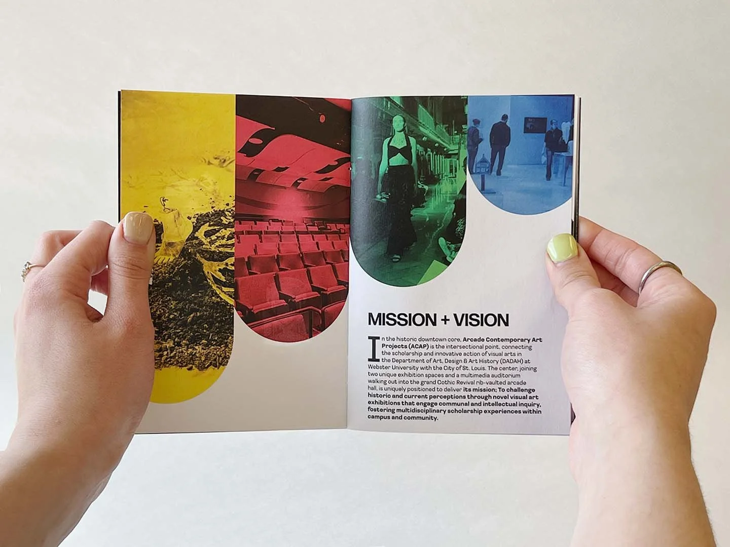 The downtown St. Louis Arcade Building is home to Arcade Contemporary Art Projects (ACAP). It is a wonderful space that includes two art galleries, an auditorium, display showcases, and a grand hallway. Although the space is in connection with my university, many students have not heard of the space and don’t know that it is available to them. To solve this issue, another intern of ACAP (Nermina Ferkic) and I collaborated to create this booklet targeted toward our fellow students. The goal is to have this booklet quickly explain to students what ACAP is all about in hopes that the space can be utilized to its full potential. This may include student-run exhibitions, artist talks, fashion shows, or musical performances.